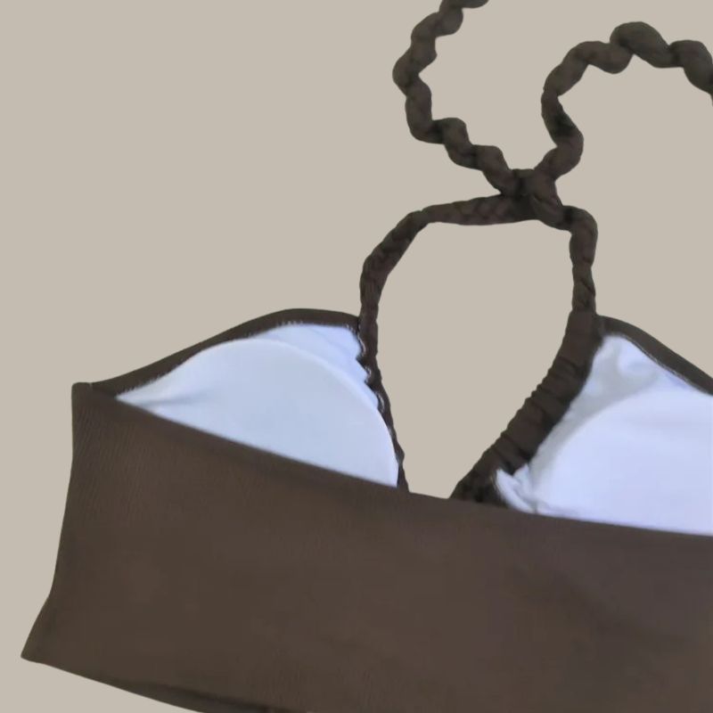 - Design: Tied halter neck, backless, high-cut