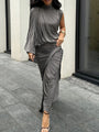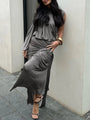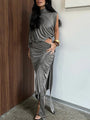 - Features: High neckline, single long sleeve, ruched texture, thigh slit for added flair