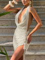 - Features: Halter neckline, backless design, adjustable bandage fit, and dramatic high split