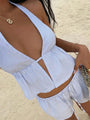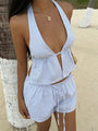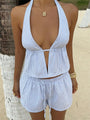 Blue Striped Two Piece Set – Halter V Neck Backless Crop Top & Shorts