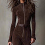 The Brown Belted Suede Maxi Dress – Long Sleeve Zipper Split Elegant Dress brings together rich texture and sleek design, offering the perfect balance of elegance, structure, and comfort.