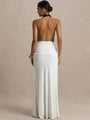 - Features: Halter deep V-neckline, backless design, high split skirt, and maxi length