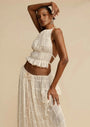 - Features: Backless crop with lace-up details and full-length flowing skirt for a chic finish