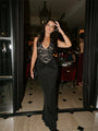 - Fit: Body-hugging at the waist with a flowing maxi-length hemline