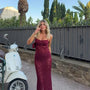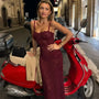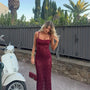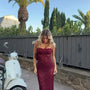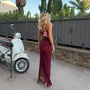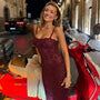 Turn heads effortlessly with the Burgundy Lace Maxi Dress. Crafted from delicate lace with a figure-hugging silhouette, this dress combines sophistication and sensuality in perfect harmony. The open back and thigh-high slit add a bold touch, while the sleek spaghetti straps offer refined femininity. Whether for evening parties, romantic dinners, or special occasions, this gown ensures you exude confidence and elegance with every step.