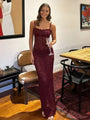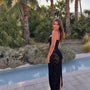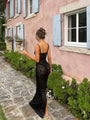 - Features: Backless design, square neckline, thigh-high slit, adjustable straps