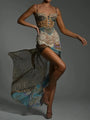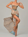 - Features: Leopard print design, lace patchwork, sleeveless cut, high-slit detail, backless style