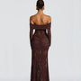 The off-shoulder neckline adds a romantic touch, complemented by long, fitted sleeves and a floor-length hem for a dramatic finish. Perfect for evening events, parties, or formal occasions, this dress ensures you shine effortlessly, no matter the moment.