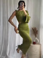 - Features: One-shoulder neckline, asymmetric sleeve, side cut-out, and ruched detailing