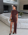 Step into sophistication with the One Shoulder Maxi Dress — where contemporary design meets timeless elegance. This stunning halter dress features a flattering asymmetric neckline and a high slit that moves beautifully with every step.