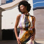 - Features: Sleeveless cut, halter neck tie, backless design, and eye-catching boho print