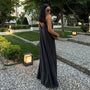 - Features: V-neckline, backless design, airy maxi length