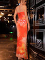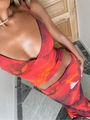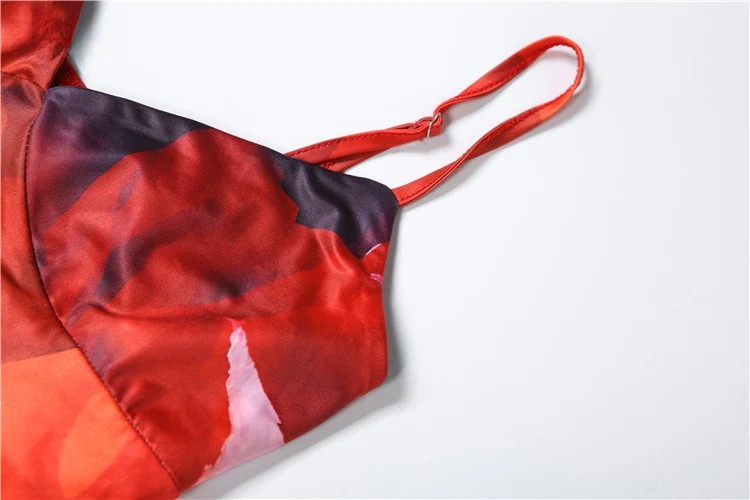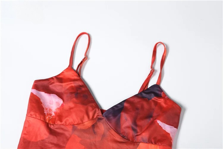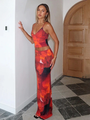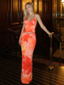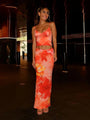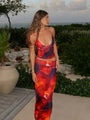 - Features: Strappy low-neck crop top, bold printed pattern, and full-length skirt
