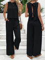 - Features: Sleeveless top with shell-trim edges, tie-back detail, and wide-leg pants