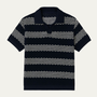 Features: Split collar, vintage-inspired horizontal stripes, ribbed hem for structure