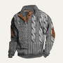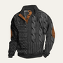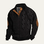 Features: Distinctive cable-knit & waffle texture, high collar with button placket, suede-look elbow patches