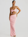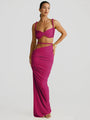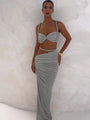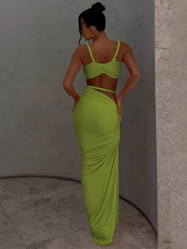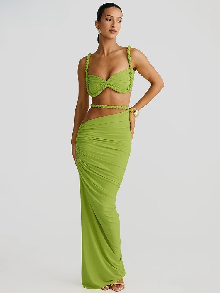 - Features: Stylish cut-out crop top, high-waisted maxi skirt, ruched detailing, and side slit
