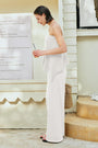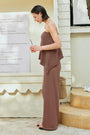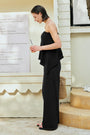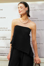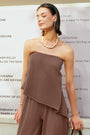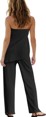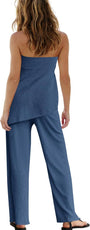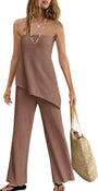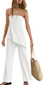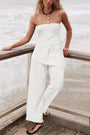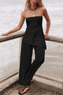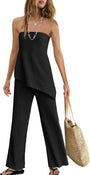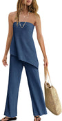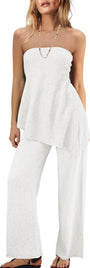 - Features: Strapless tube top with asymmetrical hem and wide-leg matching pants