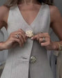 - Features: V-neck sleeveless vest, elegant button closure, and high-waisted wide-leg trousers